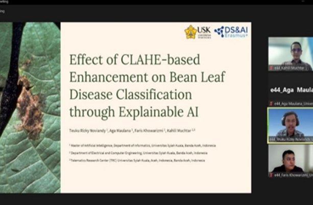 In another paper, the DS-AI team represented by Teuku Rizky Noviandy, Aga Maulana and Faris Khowarizmi, with the research title presented "Effect of CLAHE-based Enhancement on Bean Leaf Disease Classification through Explainable AI" presented research related to the effect of using CLAHE (Contrast Limited Adaptive Histogram Equalization) in improving the quality of leaf images on the performance of leaf disease classification models and applying explainable artificial intelligence (Explainable AI). Both of these studies were supervised directly by Dr. Ir. Kahlil, S.T., M.Eng. (IEEE Senior Member) and received positive responses and input from examiners at the international conference.